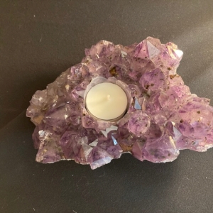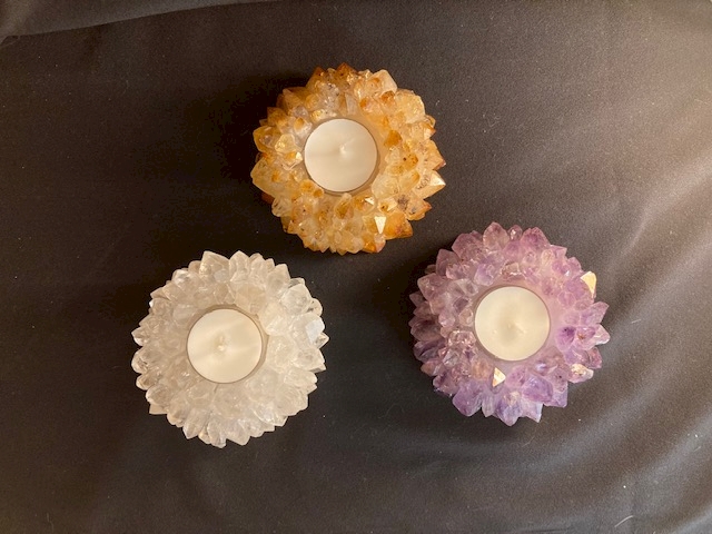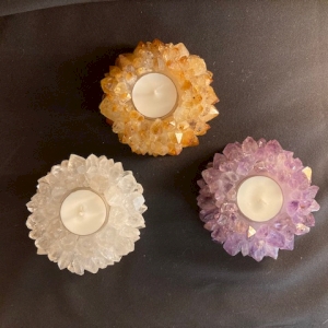 Teelichte wärmen nicht nur die Kanne auf dem Stövchen. Sie erleuchten auch das Innere von Natursteinen wie Bergkristall, Rosenquarz, Orangencalcit und Selenit und verwandeln sie in stimmungsvolle Lichtquellen.