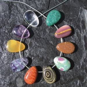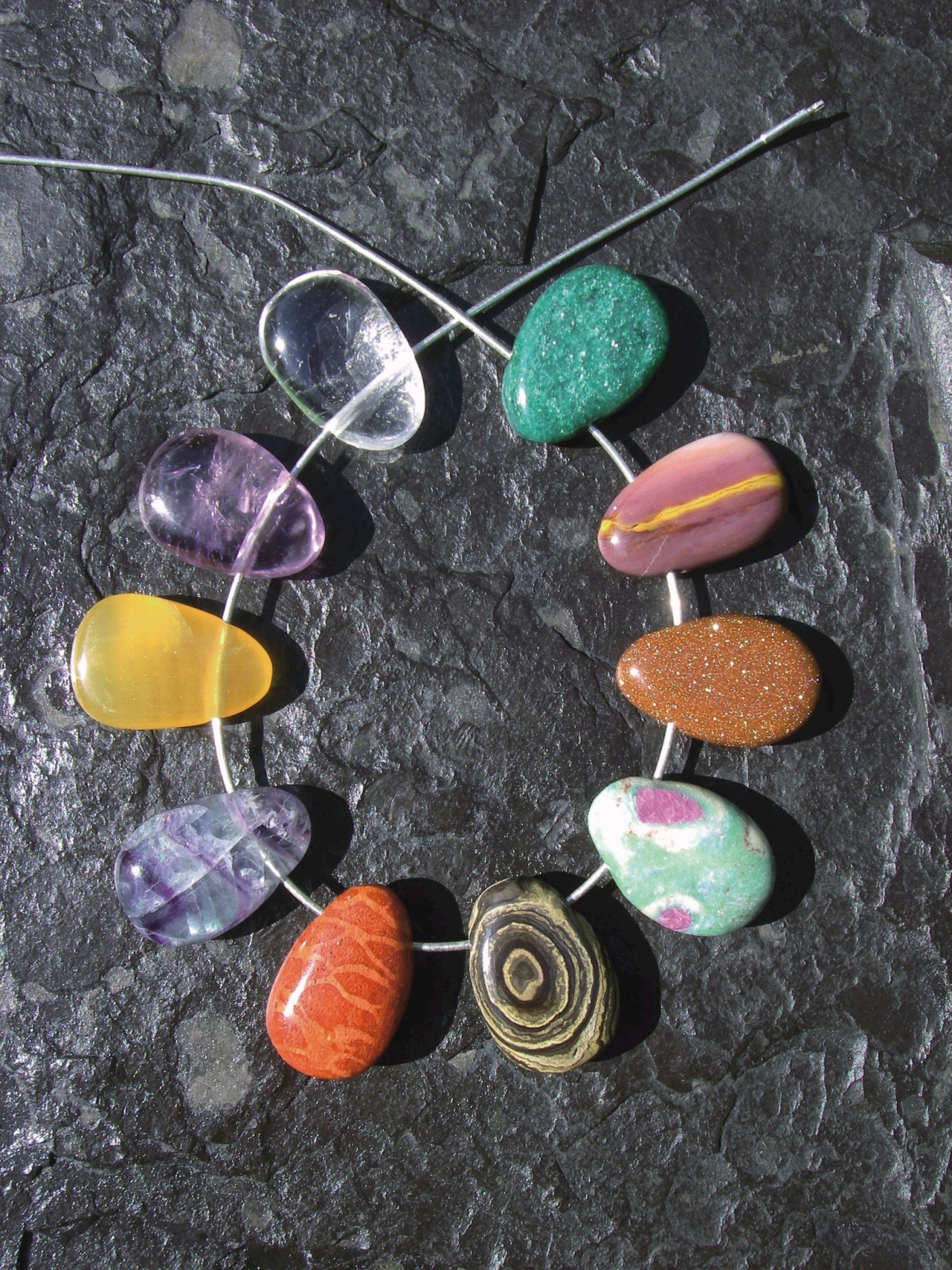 Mit ihren besonderen Maserungen und Farben wecken Natursteine die Kreativität. Als vorgebohrte Tropfen lassen sie sich auf Leder-, Kautschuk- und Seidenbänder fädeln und werden zu außergwöhnlichen Halsketten.
